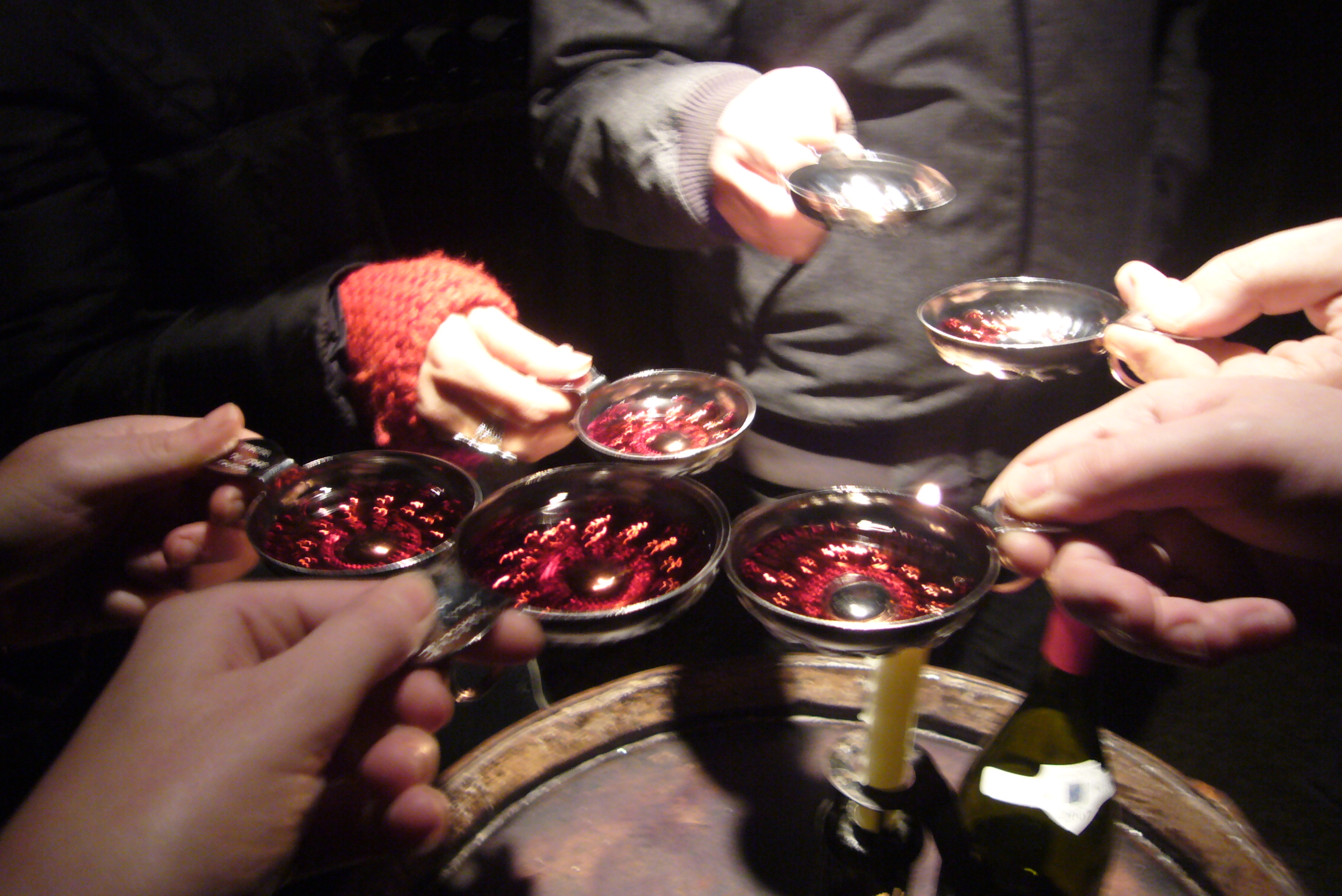 Al quinto tonel ya nos daba la risa todo. La situación era bastante «peculiar» : 6 amiguetes abrigados hasta las orejas con mini tazas metálicas en la mano buscando toneles a la luz de las velas por unos pasadizos subterráneos.