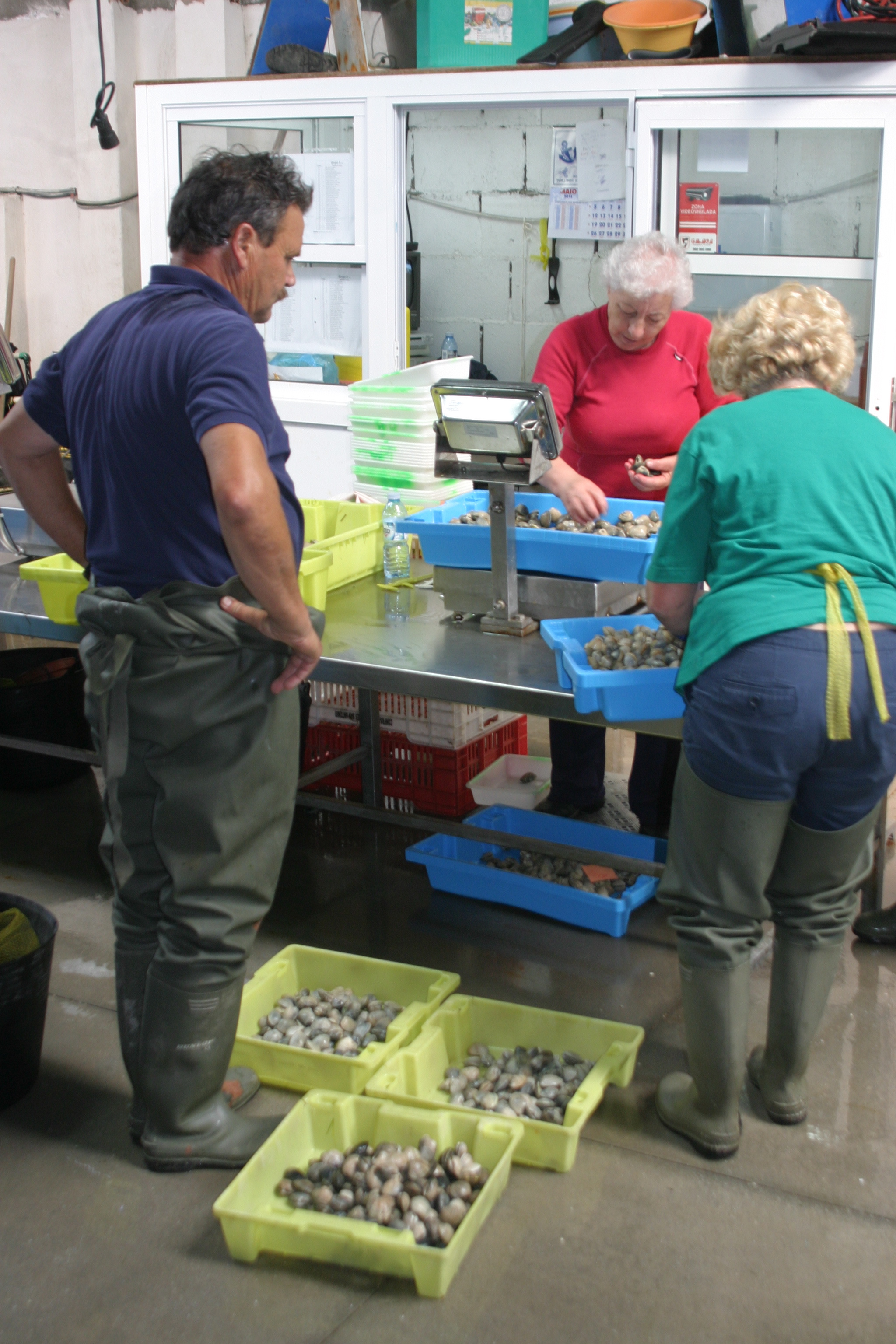 Momento de pesar y clasificar el marisco de la jornada. El exceso de cupo se junta y cubre el jornal de los que no pudieron trabajar ese día.