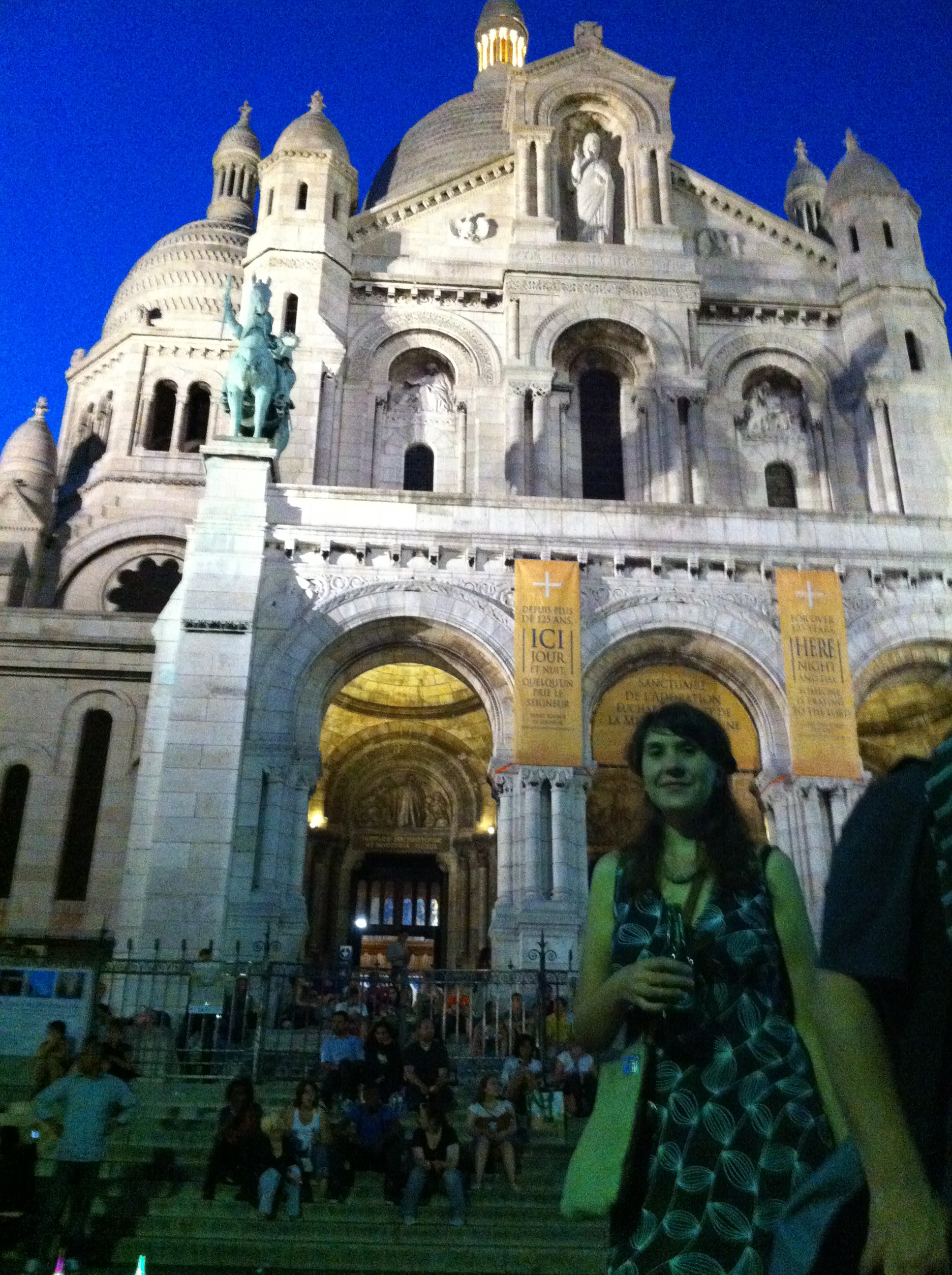 Tomando una cervecita frente al Sacre Coeur de Montmartre.Dentro no había mucha gente (y eso que era gratis porque había misa).Fuera miles de personas esperaban en las escalinatas para ver el encendido de la iluminación de París.