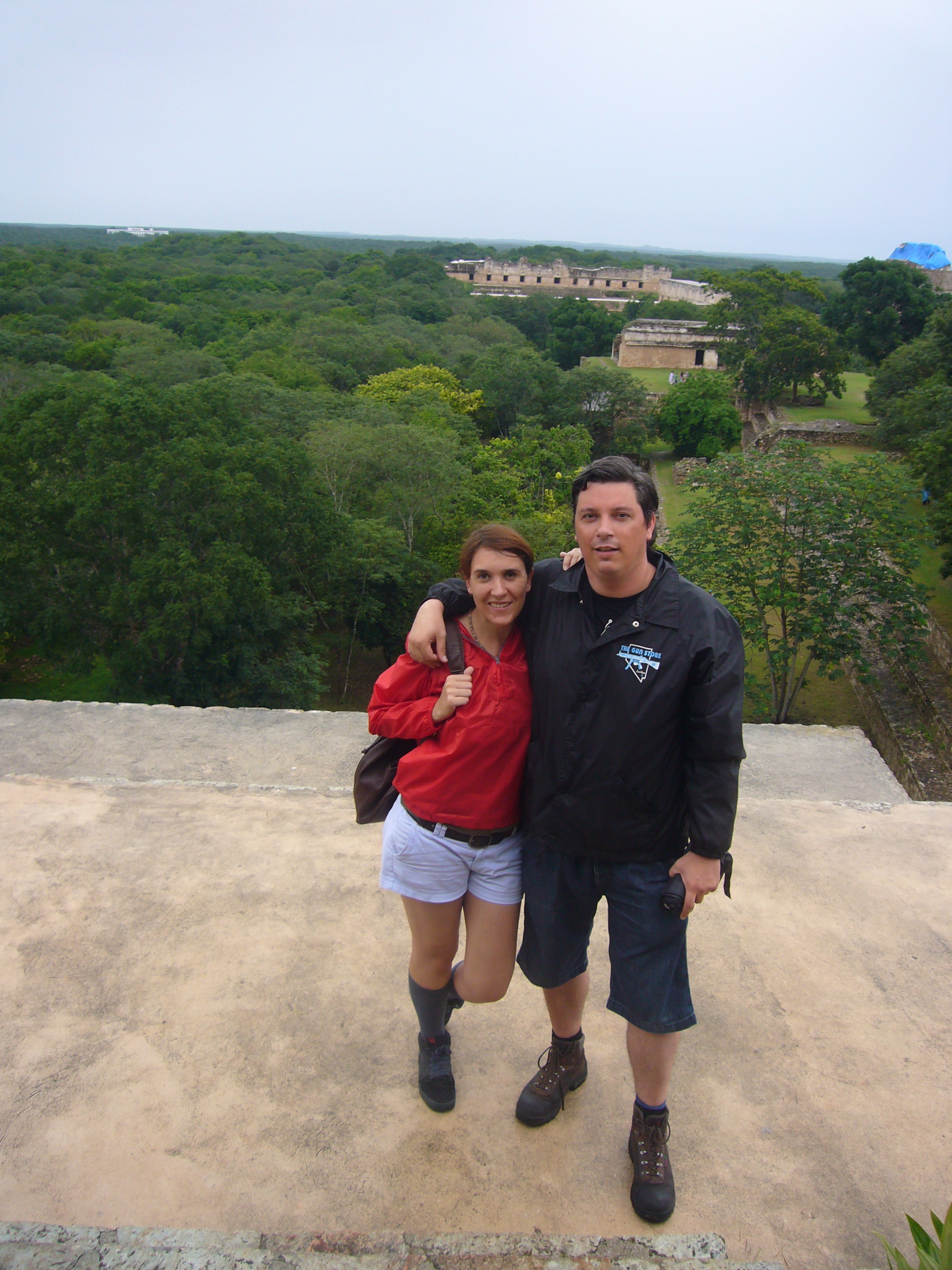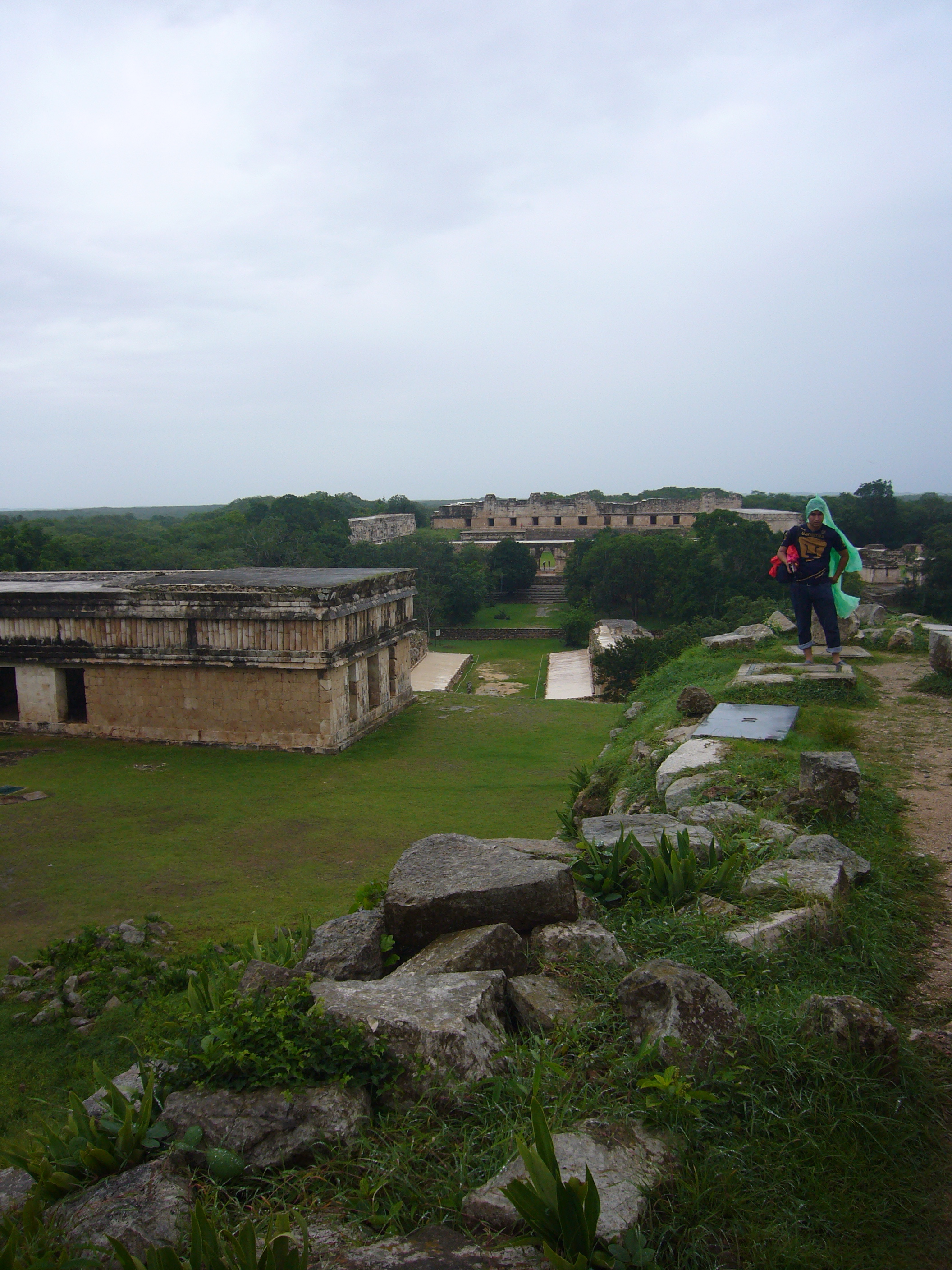 En la cima de la Gran Pirámide de Uxmal.Al fondo a la derecha y cubierta por lona azul está la pirámide del adivino.Al fondo se ve el cuadrángulo de las monjas y los templos del grupo norte.