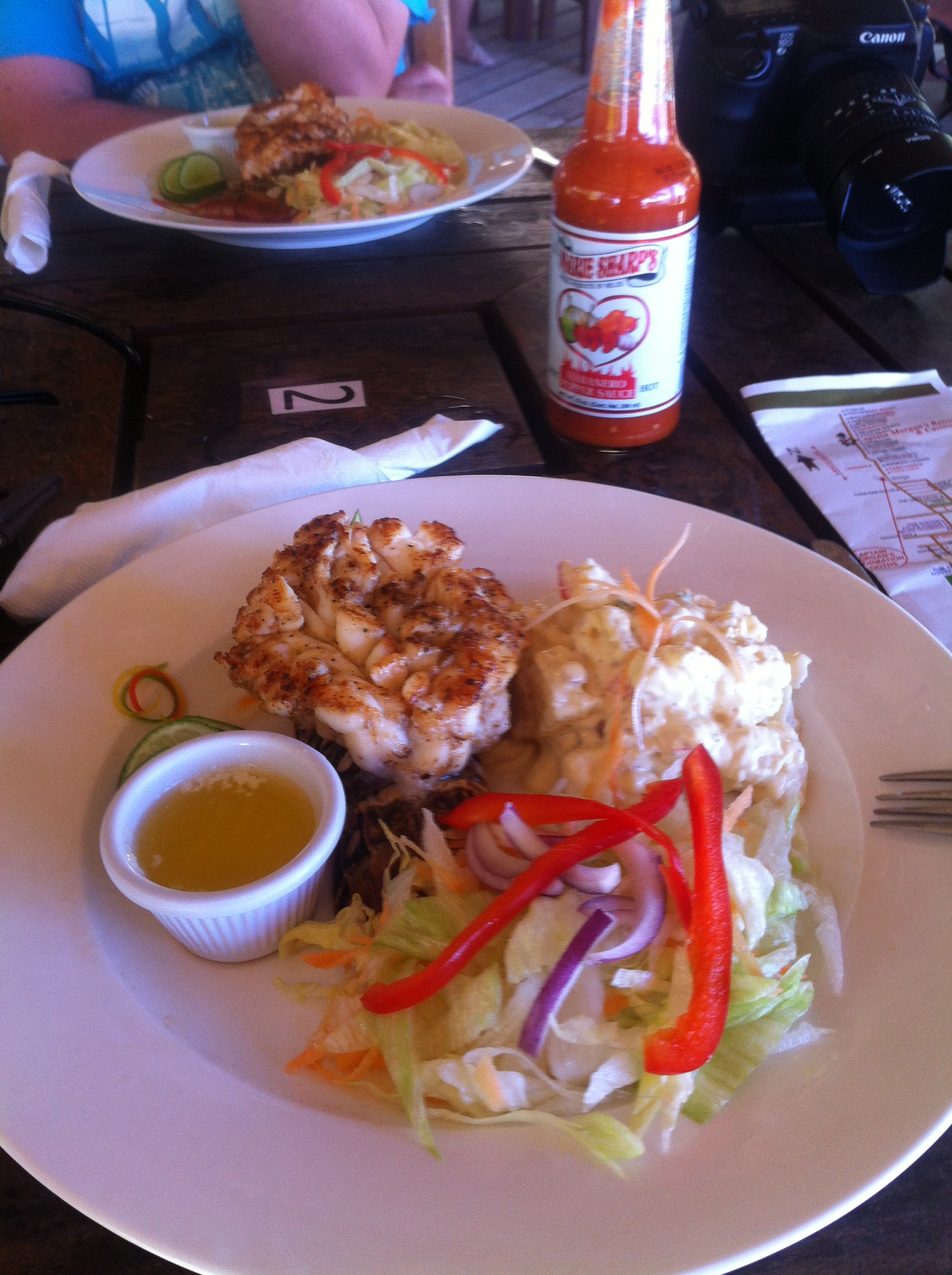 Llegaron los platos, y la langosta fue un éxito, con su puré de patata, con su ensaladita y con su matequilla derretida…y todo esto ¡con una vista espectacular al mar Caribe!