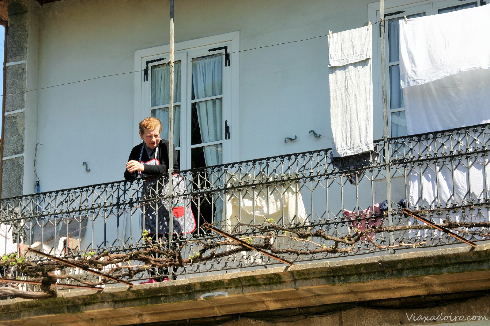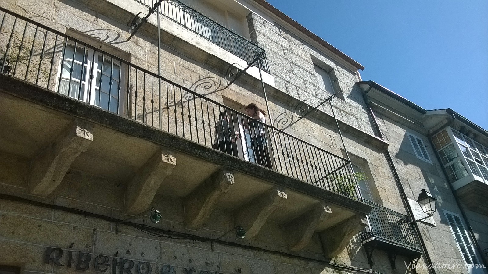 Compañeras bloggers de GaliciaTB en el balcón del alojamiento «As Casiñas» en la Plaza Mayor de Ribadavia